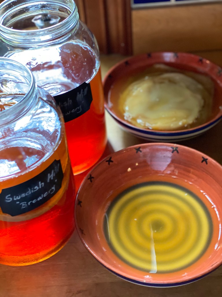 In the pictures below you can see the scoby with the brewed kombucha in one of the bowls before it’s added to the new batch. Use a strainer when you pour the “old” kombucha into the gallon jar..