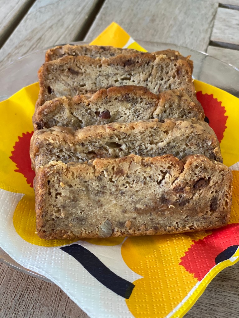 Mix the butter and agave until smooth. Add the eggs, one at a time. Put all the dry ingredients in a bowl and add to the egg mix. The last step is adding the milk, chocolate chips, and the mashed bananas.