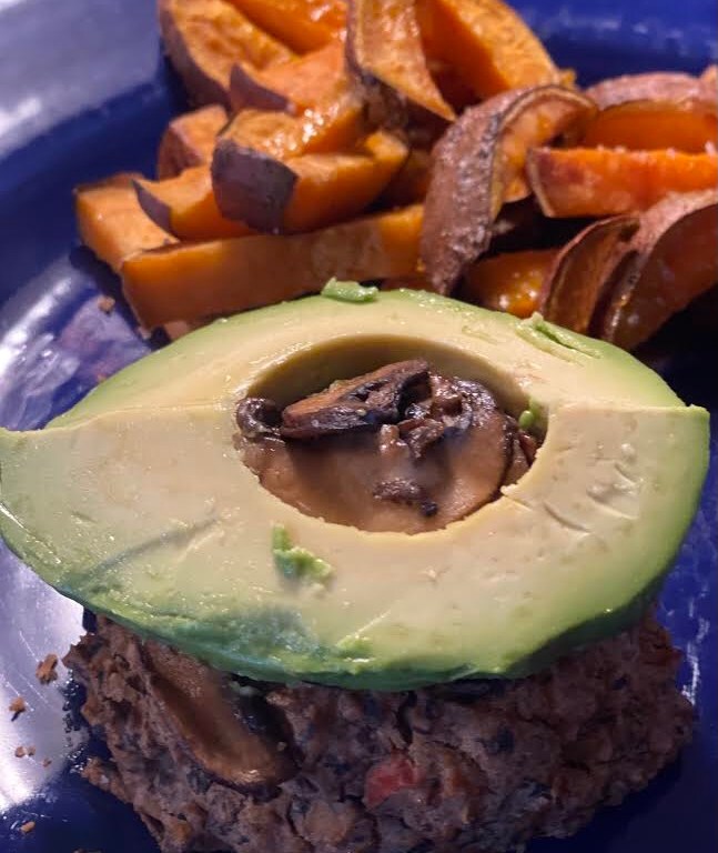 Put the black bean burger on a plate, top it with mushrooms and avocado and serve the fries on the side. I don’t use hamburger bread, but sometimes I put the burger on a large salad leaf.