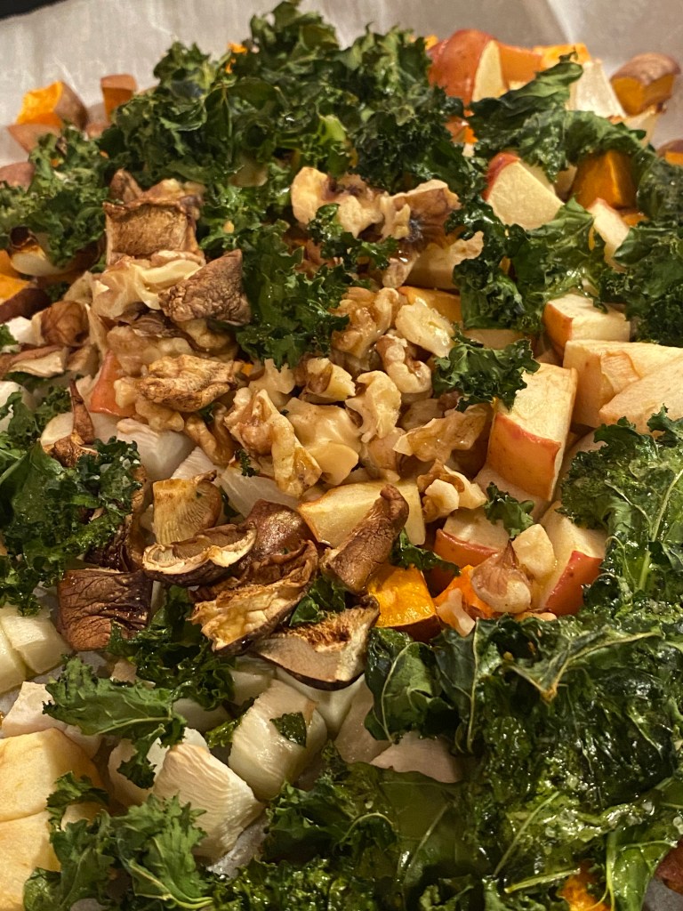 Prepare and cut up all the other vegetables and dates into pieces. Chop the walnuts. After 25 minutes, add the apples and the mushrooms to the sweet potatoes and continue to bake at 400 for 10 more minutes. Add the walnuts and kale (drizzle a little more olive oil) and bake for 10 more minutes (total 45 minutes).