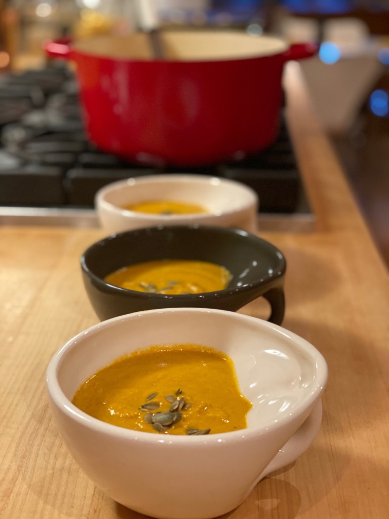 Pour into serving dishes and decorate with roasted pumpkin seeds.