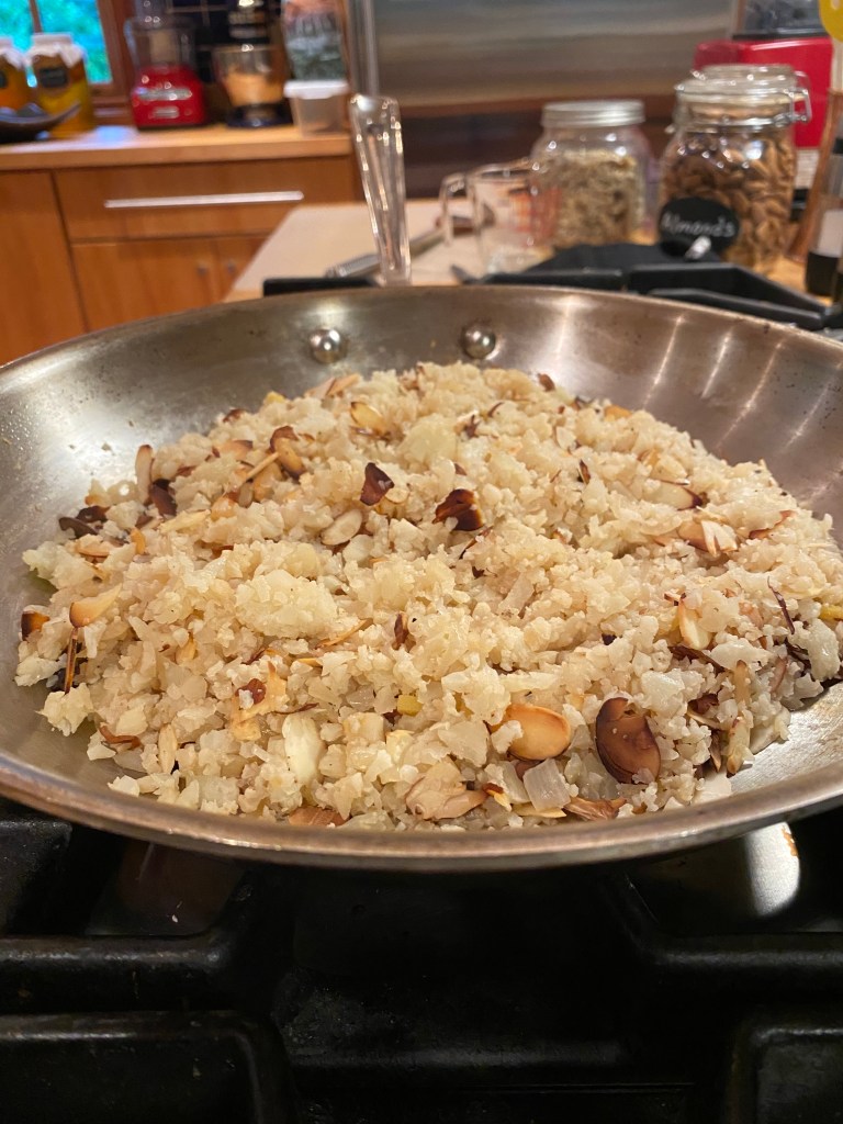 Put batches of the cauliflower in a food processor and pulse till it looks like rice. Saute onion, garlic and ginger until soft. Add the cauli-rice and continue to cook for about five more minutes. Add the water, cover the pan and let it all steam on medium/low until the cauliflower is soft and the water has been absorbed (it takes about five minutes). Take the pan off the burner and add the sliced almonds. Tastes great with cooked salmon.