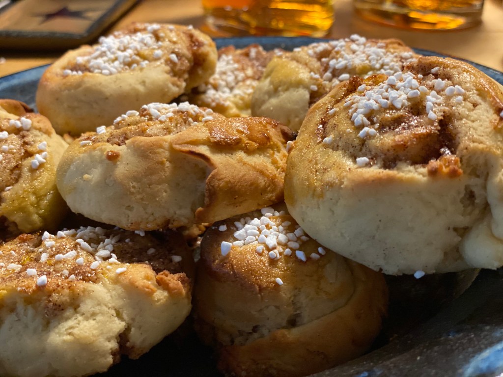 Take out the cinnamon buns and turn the oven on (450 degrees F or 225 C). Brush the cinnamon buns with the whipped egg and sprinkle the pearl sugar or chopped almonds on top. Bake the cinnamon buns for about 10 minutes.
