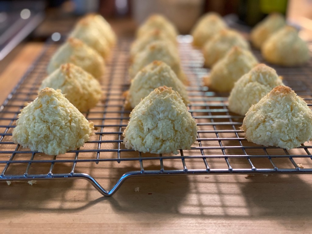 Mix eggs and sugar. Add the shredded coconut, lemon peel and melted butter. Make small pyramid shaped balls and put them on a parchment covered baking tray.