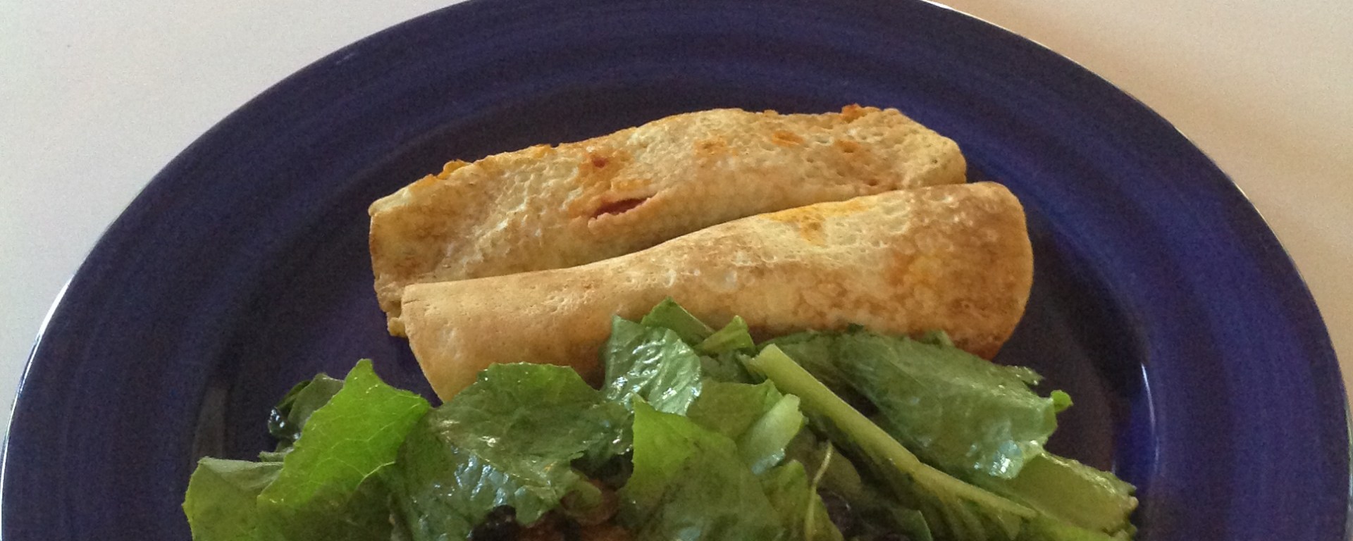 Crepes is an easy but still festive dish. The filling can be anything you have in the fridge. I often just fill them with chunky salsa, served with a side salad. Pictured is also homemade blackberry kombucha. (Blackberries and lettuce from Star Hollow Farm).