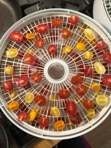 Cut the tomatoes in half and put them on dehydrator trays or on a broiler tray. Dry the tomatoes over night in a dehydrator or oven.