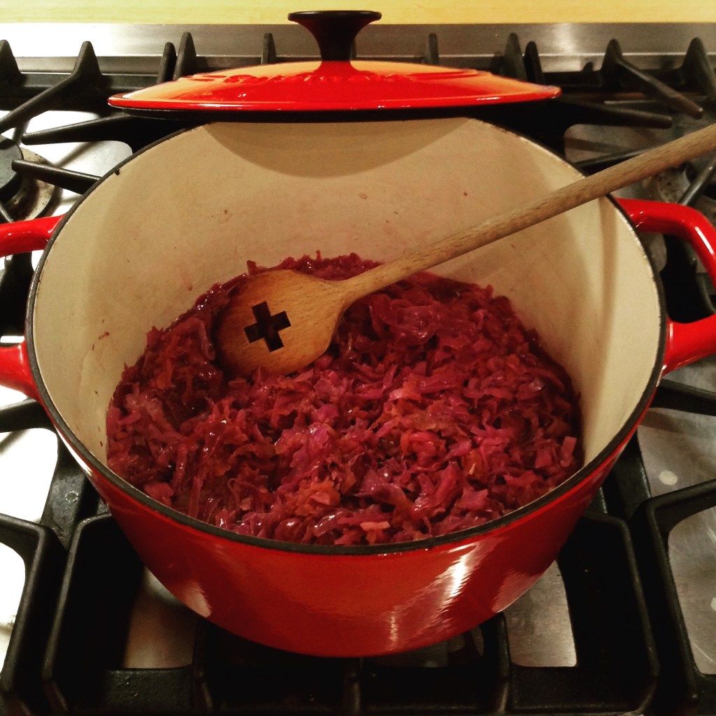 Melt the butter in a heavy saucepan or Dutch oven. Fry the onion on low heat 5-10 minutes, until soft. Add the cabbage, apples, salt, all spice and cloves and simmer for about one hour. Keep the lid on the pan. When the cabbage is soft, remove the pot from the burner, add the honey, vinegar or lemon juice. This dish can be made in advance and kept in the fridge for a couple of days or in the freezer for at least a couple of weeks.