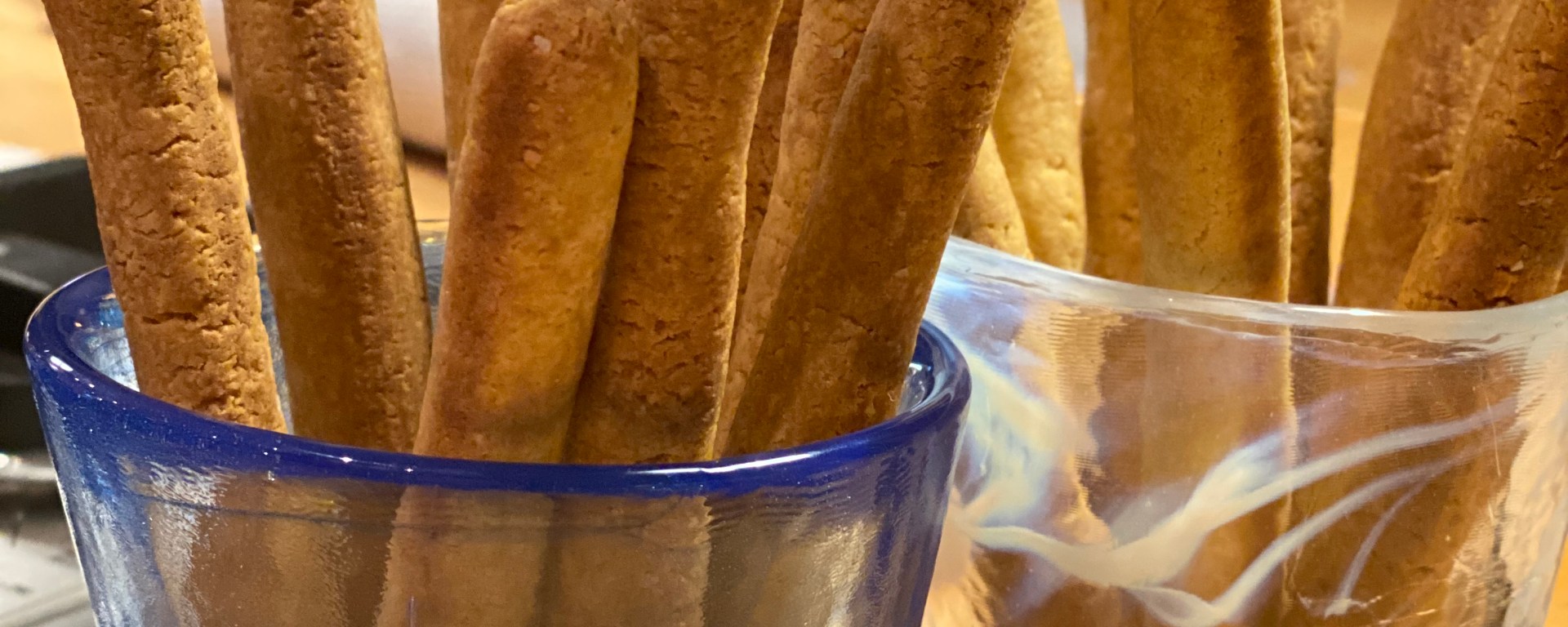 Put all the ingredients in a stand mixer, or mix by hand till a ball forms. Cut the ball into 20 pieces and roll each piece out into a finger thick stick. Place the breadsticks on a parchment covered baking tray and bake for 15 minutes. Turn them once.