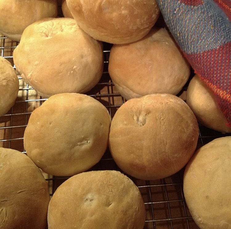 Put the dough on a flour dusted surface and cut into two pieces. Make each piece into a roll and cut each roll into 10-12 pieces. Roll the pieces into buns and put them on a parchment covered baking tray. Don’t put the buns too close to each other on the baking tray. Let the buns rise for about 30-40. minutes.