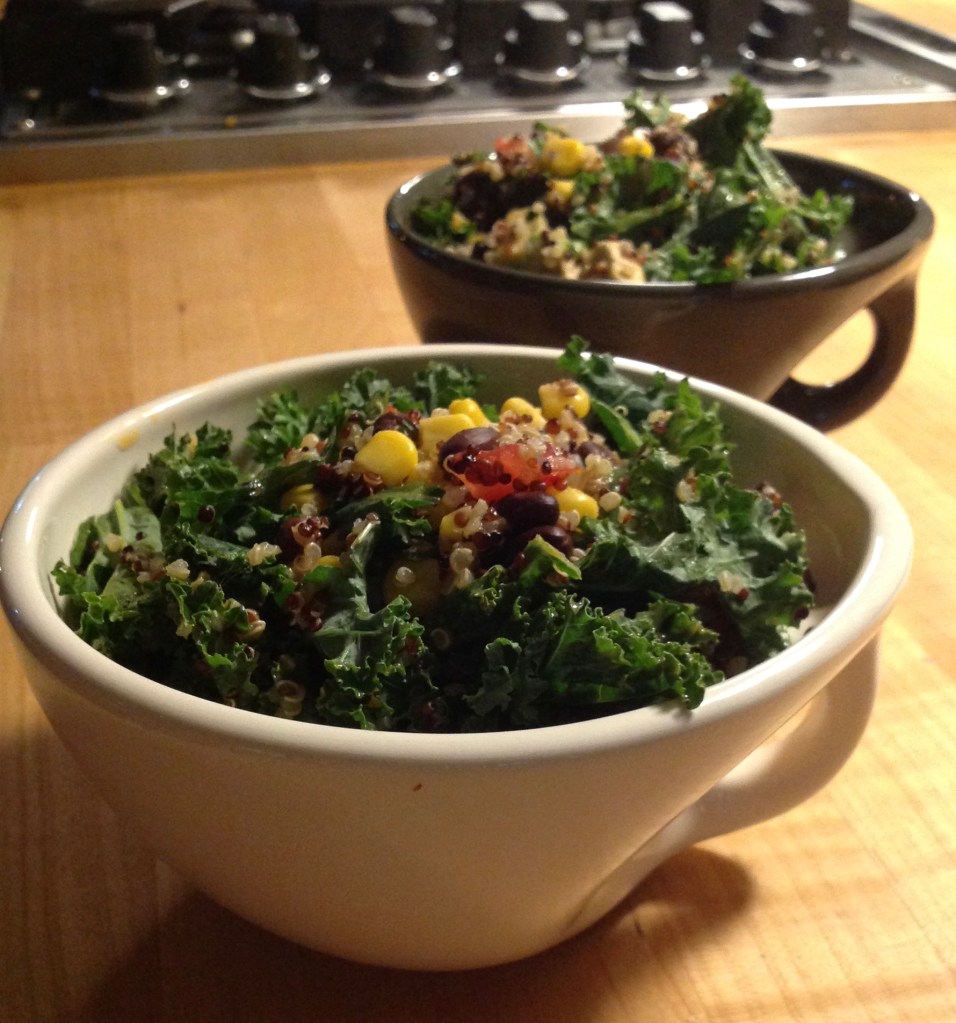 Rinse the quinoa and put in a sauce pan with the water. Add a little salt. When the water starts to boil, put the lid on the sauce pan, lower the heat and let simmer for about 15 minutes or till the water is absorbed. Add the black beans and the corn to the quinoa and mix it up. Place in a salad bowl and add the rest of the salad ingredients.