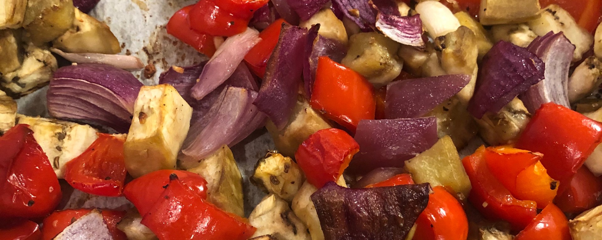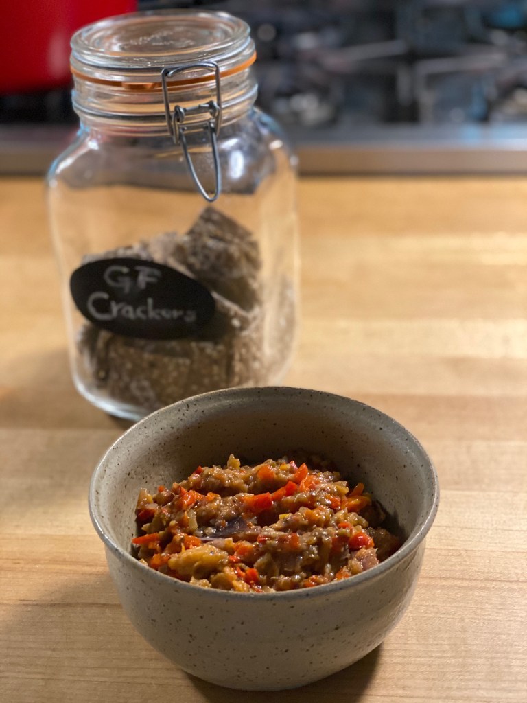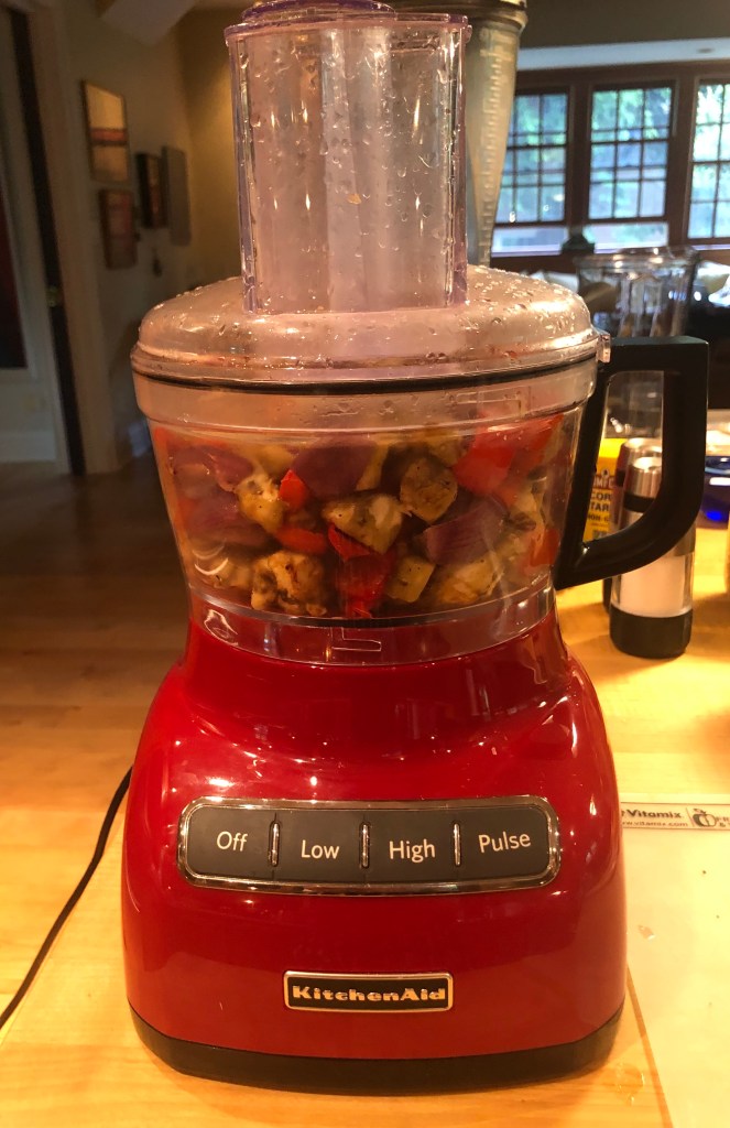 Cut the eggplant, bell peppers, and onion into 1″ cubes. Toss them in a large bowl with the garlic, olive oil, salt, and pepper. Spread them on a baking sheet. Roast for 45 minutes, until the vegetables are lightly browned and soft (tossing once during cooking). Cool slightly. Place the vegetables in a food processor, add the tomato paste, and pulse 3 or 4 times to blend. Taste for salt and pepper.