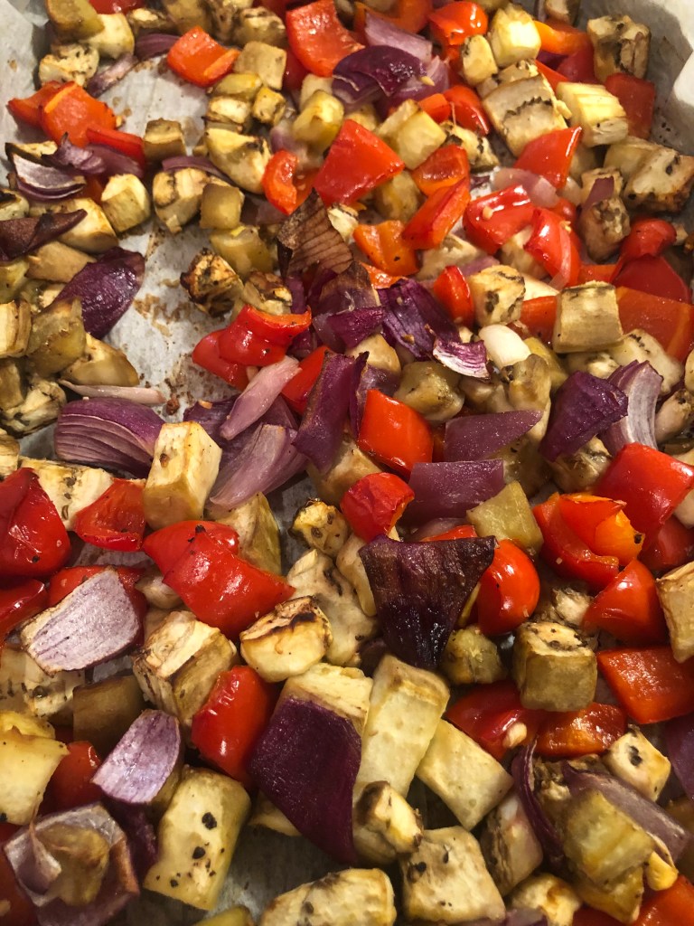 Cut the eggplant, bell peppers, and onion into 1″ cubes. Toss them in a large bowl with the garlic, olive oil, salt, and pepper. Spread them on a baking sheet. Roast for 45 minutes, until the vegetables are lightly browned and soft (tossing once during cooking). Cool slightly. Place the vegetables in a food processor, add the tomato paste, and pulse 3 or 4 times to blend. Taste for salt and pepper.