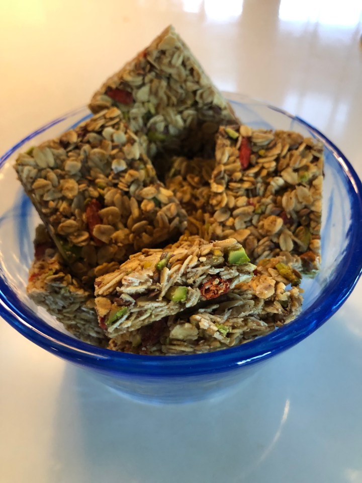 Combine honey or agave with vanilla extract and coconut oil in a saucepan. Cook over medium-low heat. Stir constantly until the coconut oil has melted. Add the almond butter and continue cooking for a few minutes until well mixed. Remove the saucepan from the heat and add the Goji berries. Pour the mixture over the oats, pistachio and flaxseeds, and mix well.