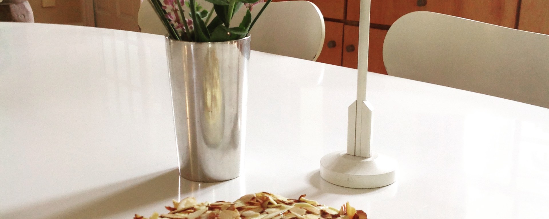 Spread half of the topping on one cake layer and put the other layer on top. Spread the remaining topping on the top layer and decorate with the sliced almonds. Keep in the fridge at least a couple of hours before serving.