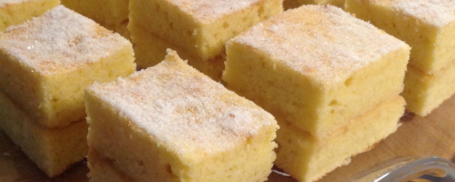 Pour the batter onto a parchment paper covered baking tray and bake for 8-10 minutes or until the cake has a nice color. Remove it from the oven and sprinkle half of the cake with sugar. Once the cake has cooled, cut it into two pieces and remove it from the parchment paper. Spread applesauce or jam on the half without sugar and put the other half on top. Cut into fifteen squares.