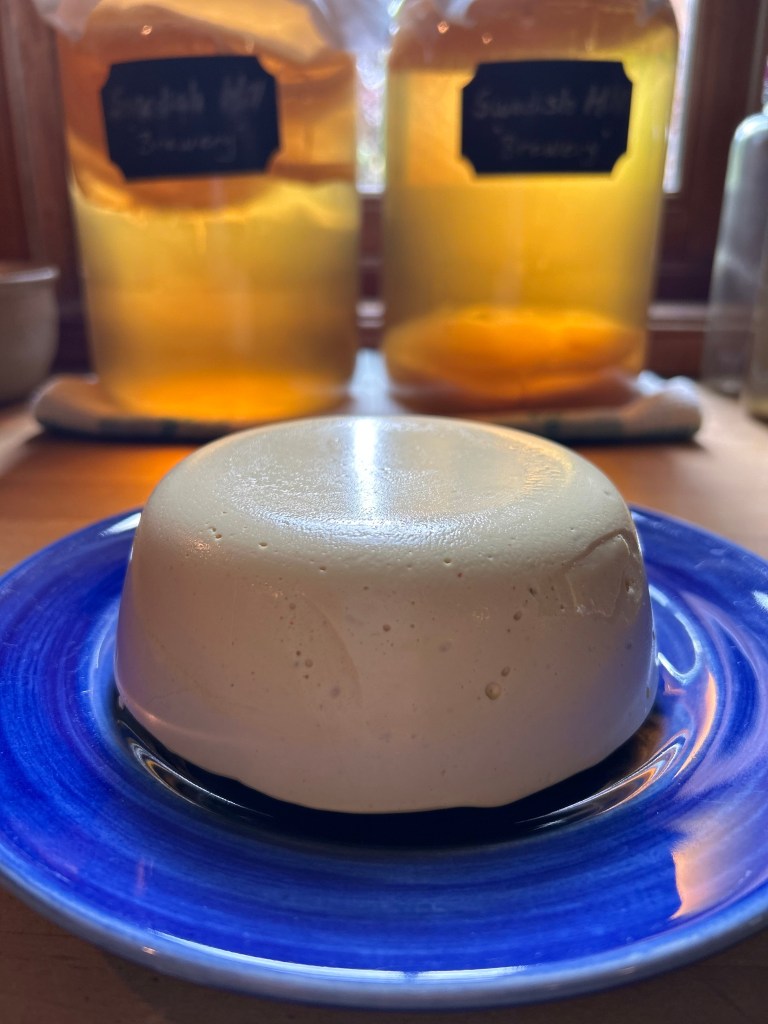 Cover the cheese with plastic wrap and put in the fridge to set. When the cheese feels hard to the touch, turn the bowl up-side down, cover and keep in the fridge.
