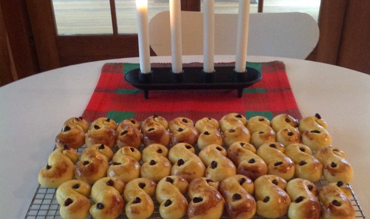 50 g yeast (3 t if using dry yeast) 2 cups (5 dl) milk 3/4 cup + 1T (2 dl) sugar 200 g butter 1 g saffran 1 t salt 2 eggs, lightly beaten 6 cups (14 dl) all purpose … Continue reading Ulli’s Lussekatter (saffron buns) (serves 25-30)